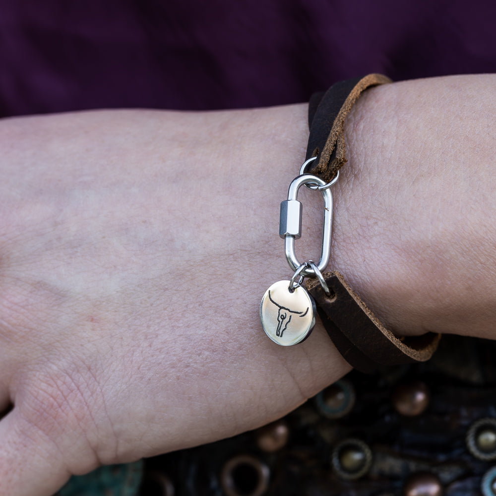 Mixing all of our favorite things this Leather Icon Bracelet is perfect for everyday wear. Layer it or wear it alone, the stainless steel carabiner holds the icon logo charm representing our love of rodeo and country music.